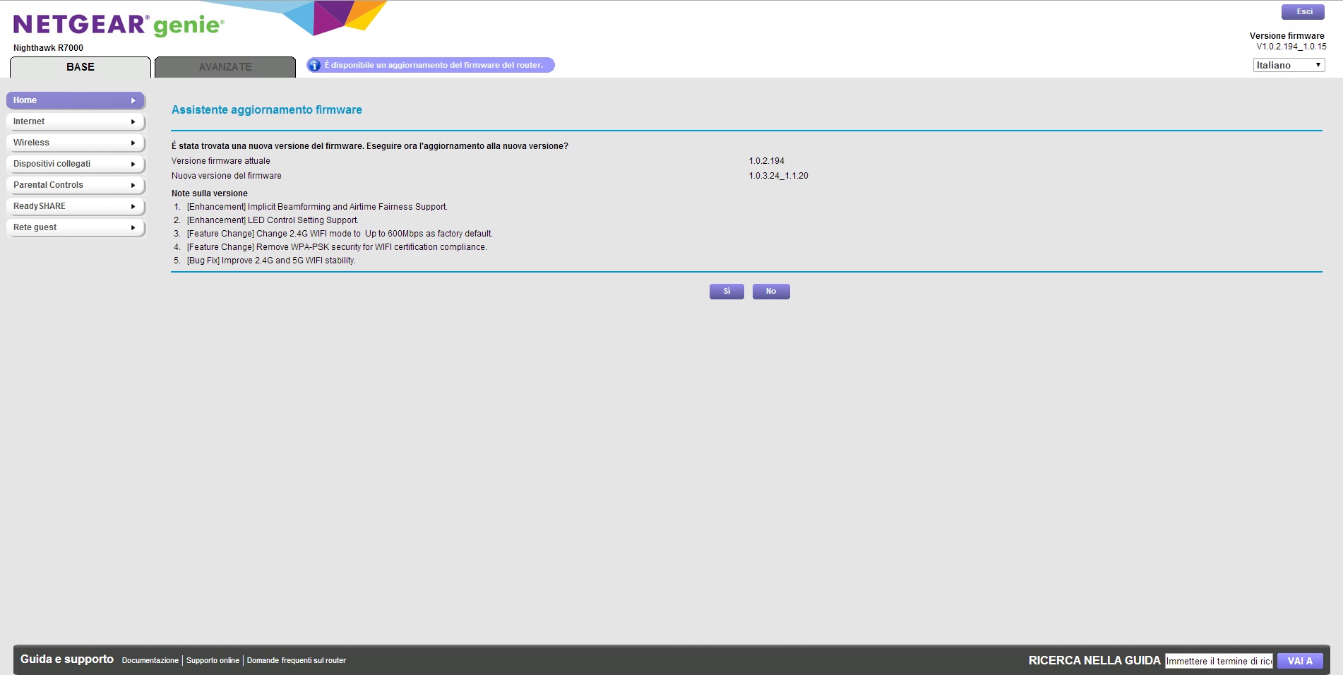 Come possiamo vedere, a router collegato e configurato, troveremo subito un aggiornamento Firmware che andrà a correggere alcuni Bug e aggiungere e fixare delle caratteristiche. Passeremo dunque dalla versione 1.0.2.194 alla versione 1.0.3.24_1.1.20.