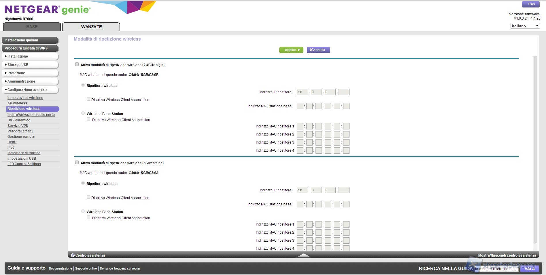 Il Nighthawk R7000 è dotato come tutti i router e modem di Netgear del menù Rete Guest che ci permetterà di gestire come avveniva per il menù di configurazione Wireless la chiave ci cifratura e la funzionalità di isolamento o meno del segnale wireless per entrambe le bande wireless disponibili e quindi magari utilizzarne soltanto una.