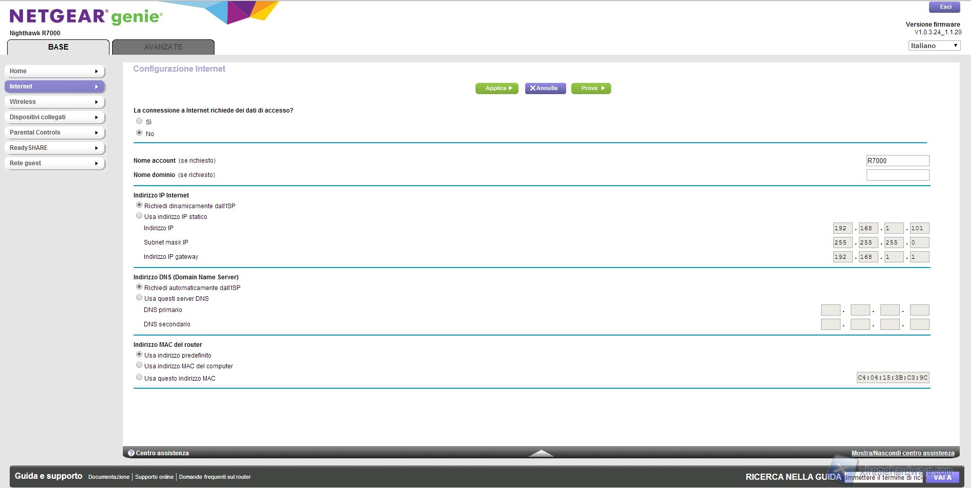 Partiamo dalla tab configurazione internet, nella quale avremo la possibilità di settare i parametri relativi al nostro ISP e gli indirizzi DNS. Infine ci sarà la possibilità di settare la tipologia di indirizzo MAC da utilizzare.